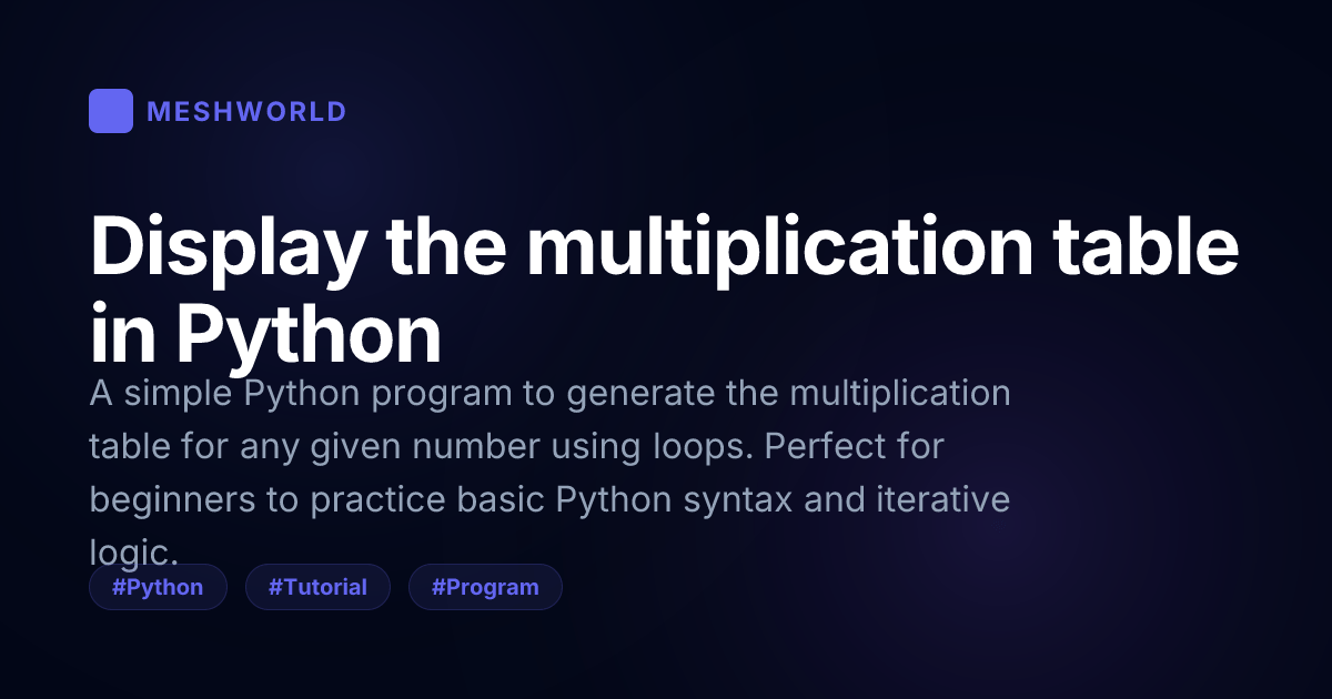Uncomment num = int(input("Get multiplication table for? ")) line if you want to take input from user. For illustrating example we’ve assign a fix value to num variable i.e 12.